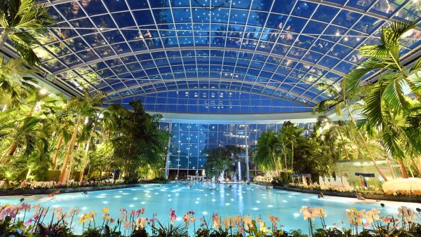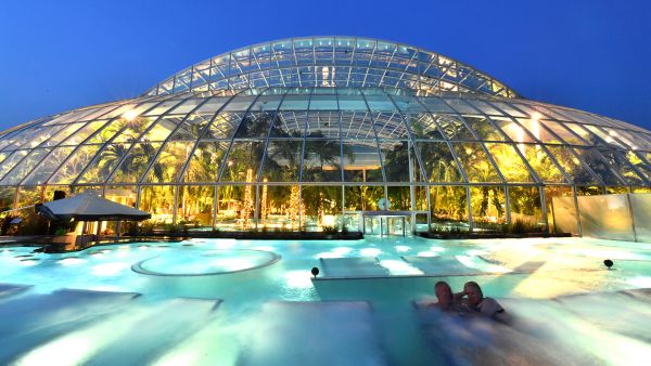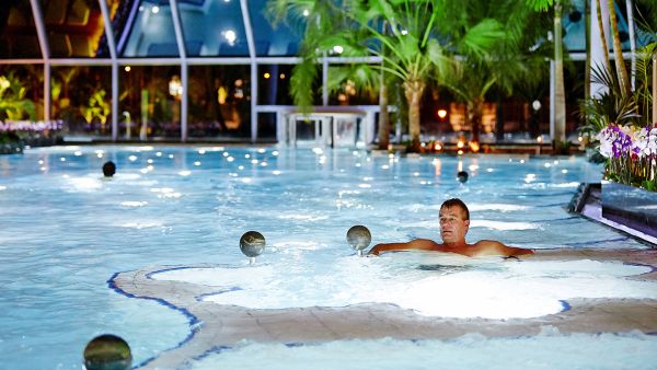 Entdecke die Große Lagune und genieße das wohltuende 33° C warme Wasser. Umringt von echten Palmen und Orchideen spürest du Urlaubsfeeling pur. Während die Kraft des Wassers auf den Sprudelliegen für echte Entspannung sorgt, schweift dein Blick in den Sonnen- oder Sternenhimmel. Genieße Erfrischungen an der Poolbar und schwimme ins angeschlossene Außenbecken mit Blick auf den 6.500 m² großen Natursee. Entspanne in den Quellen der Gesundheit, einer Wohltat für Körper und Seele.