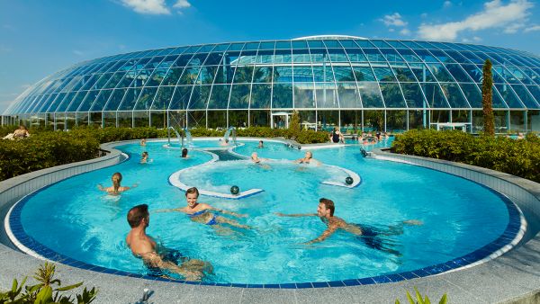 Genieße das wohlig warme Wasser unter freiem Himmel! Lasse dich von der Großen Lagune ins Außenbecken treiben und dich von den Sprudelliegen und Whirlpools entspannen.