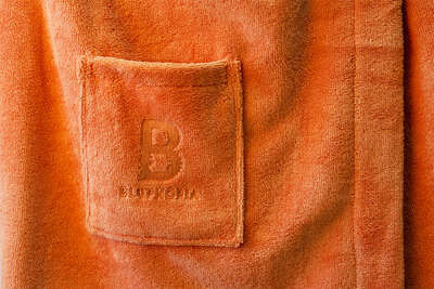 Ein praktischer Klettverschluss sorgt für perfekten Halt und hohen Tragekomfort, während die sanfte Apricot-Farbe deinem Wellnessmoment eine warme, stilvolle Note verleiht. Die dezente Hoch-Tief-Webung mit BLUPHORIA-Logo macht den Saunasarong zu einem edlen Begleiter – zeitlos, elegant und einfach schön.