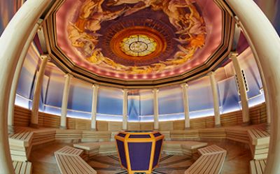 Betrete die antike Tempelanlage des griechischen Sonnengottes Apollon. Hier empfängt dich der griechische Gott des Lichts inmitten des ionischen Säulenkranzes. Er symbolisiert Reinheit und Heilung. Die außergewöhnliche Lichtstimmung und der Aufguss mit reinen Mentholkristallen entführen Sie in den Olymp der Genüsse (ca. 90° C).