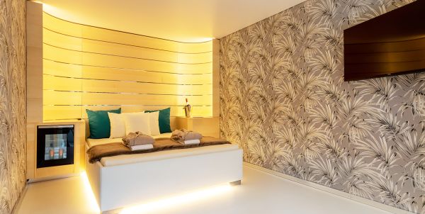 Buch dir exklusiven Rückzugsort für besondere Momente. Ausgestattet mit einem gemütlichen Wasserbett, Flatscreen & eigenem Kühlschrank (1 BLUPHORIA Little Lotus Set, 1 prickelnde Fl. Champagner Laurent-Perrier Cuvée Rosé, 2 Fl. Wasser & 2 Bluphoria Power Drinks). Außerdem ist im Paket ein gratis Leihwäscheset (2x Bademantel und 2x Handtuch) enthalten.