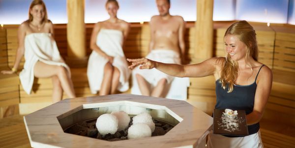 Gruppe von Menschen sitzen bei einem Aufguss in der Apollon-Sauna